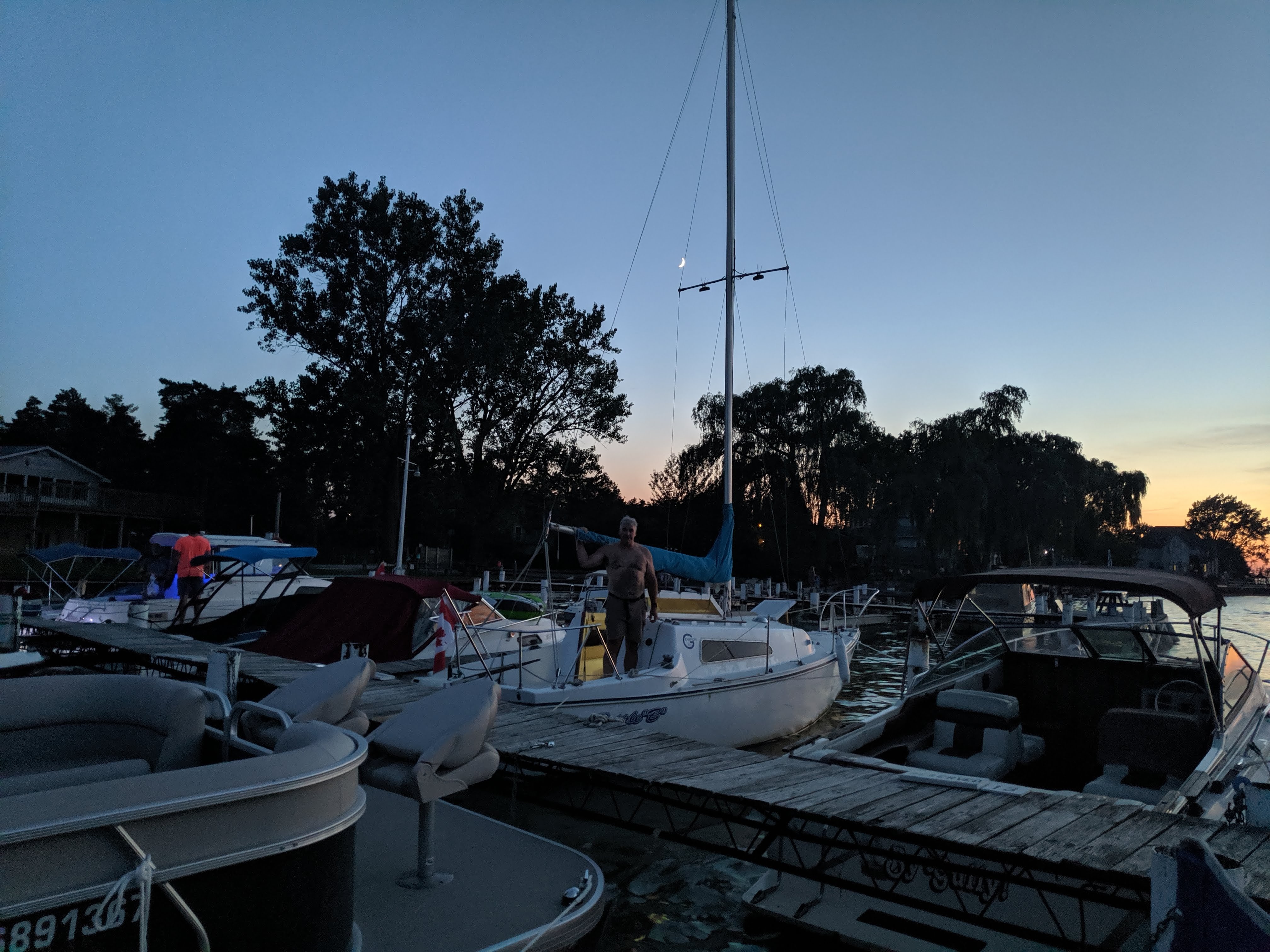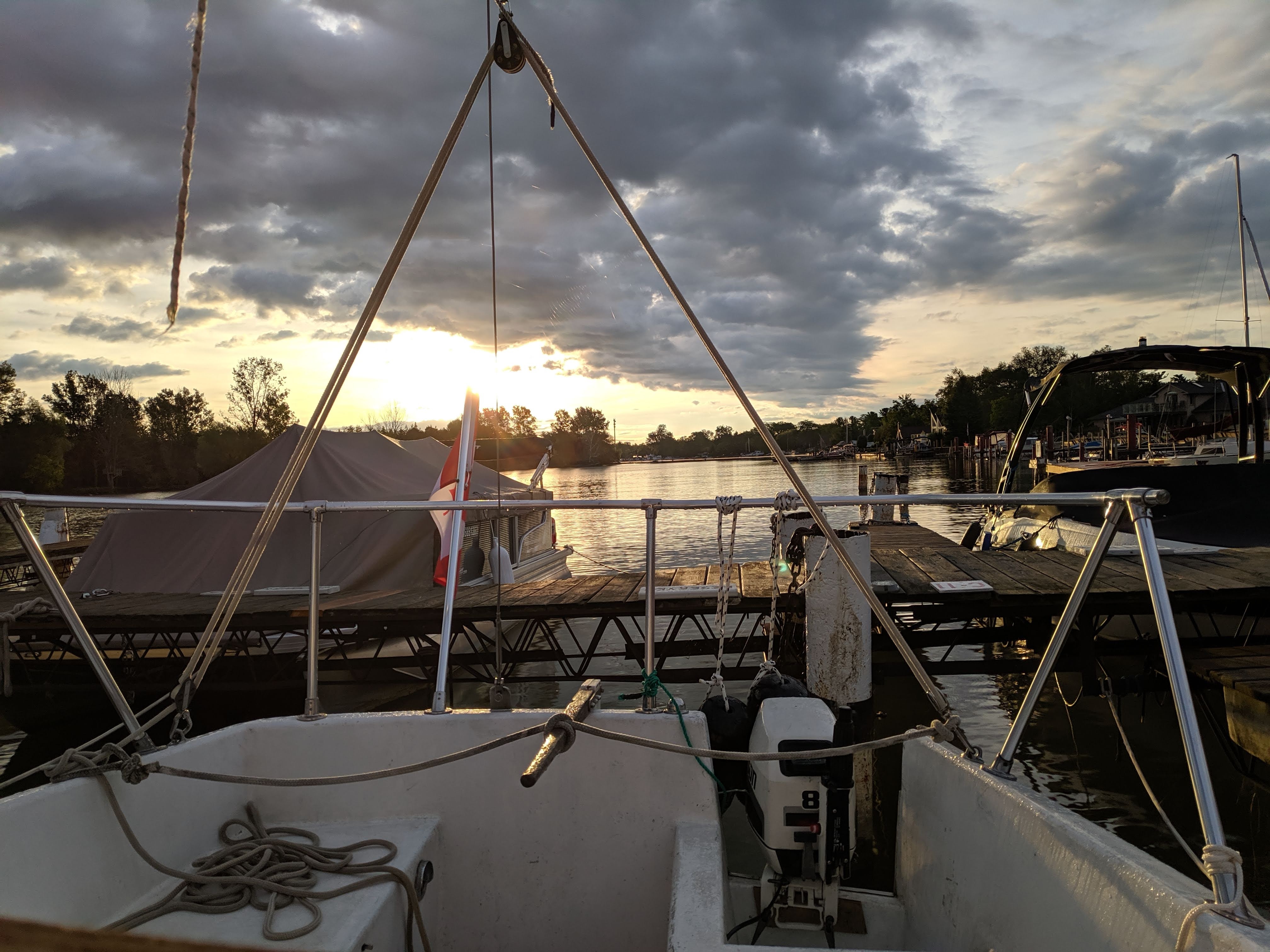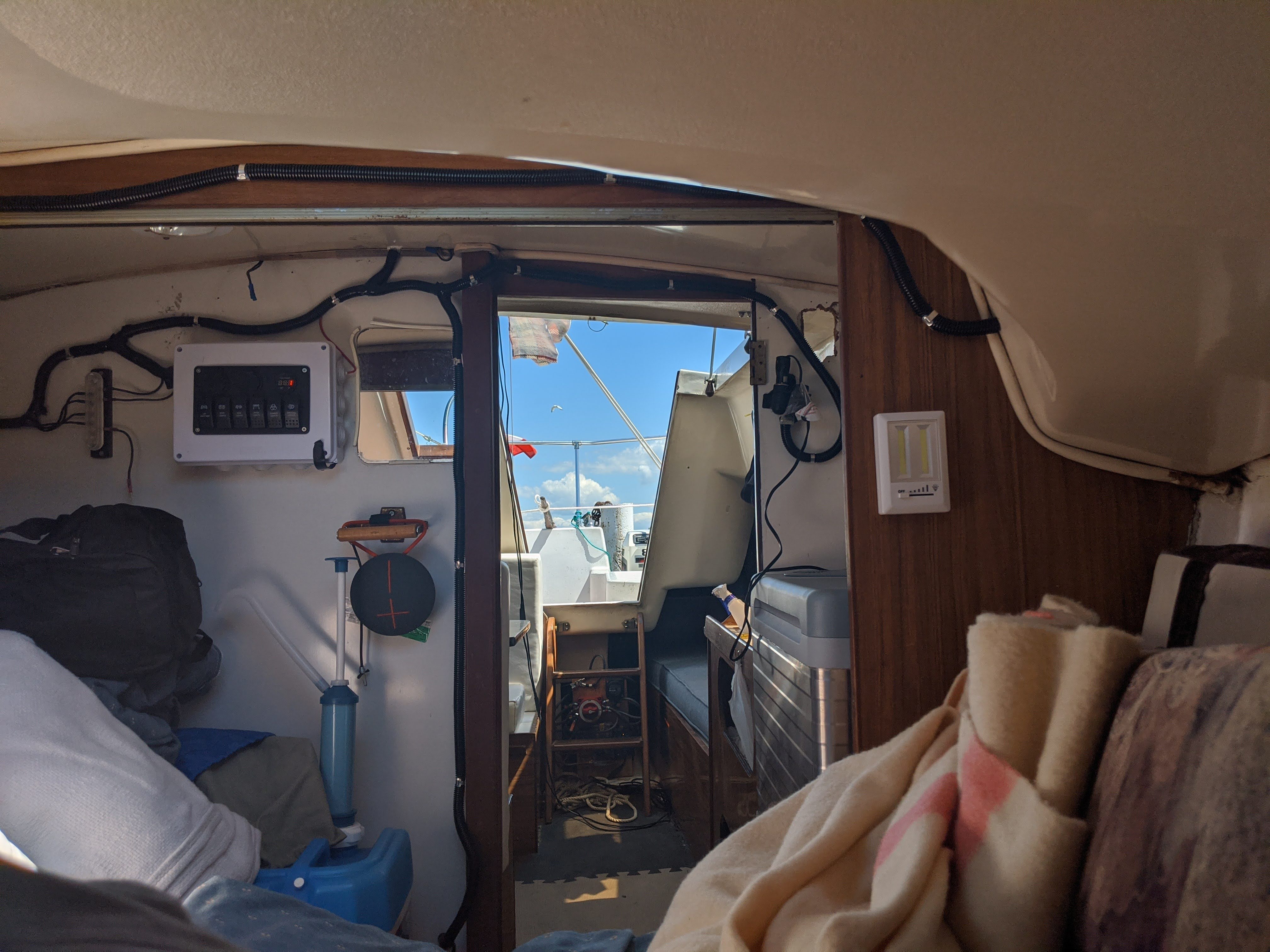 The boat has been rewired and bulkhead repaired for shroud plates. The hull below the water line has been repainted. Solar panels (3 x 40 = 120 watts ) and motor are setup to charge a dual battery system using a ACR ( automatic charging relay to isolate and charge batteries when needed. Added a cooler and new toilet too. All lights are LED . Replaced shroud lines port and starboard. We have been having a great time staying aboard and sailing and cruising this summer.